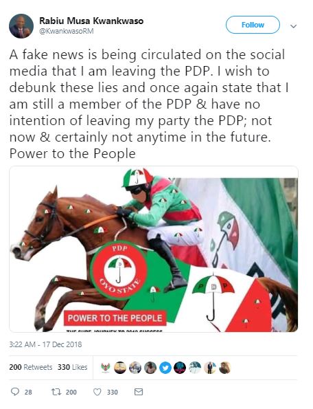 In a statement via Twitter, He described the report as ‘Fake news’ adding that he is in the PDP to stay. He wrote;